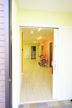 スロープを上がると玄関があります。インターホンを鳴らしてお入りください。